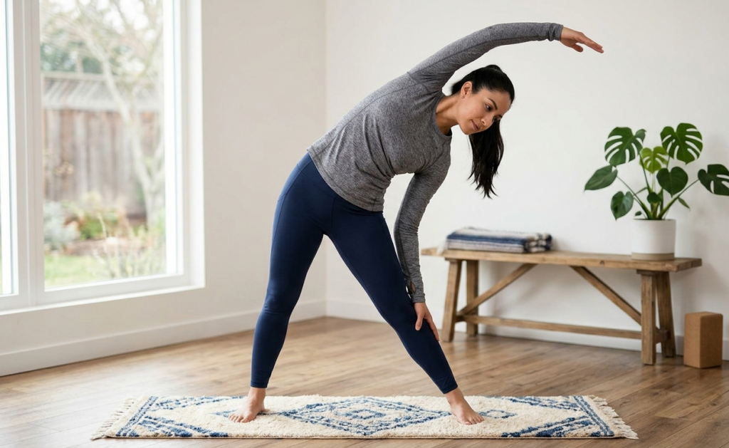 A continuación, cambia a una posición de pie. Inclínate suavemente hacia la derecha, estirando el lado izquierdo del torso. Repite al otro lado. Cada lado debe quedar en tensión durante 20 segundos, ayudando a liberar la tensión en la espalda baja.
