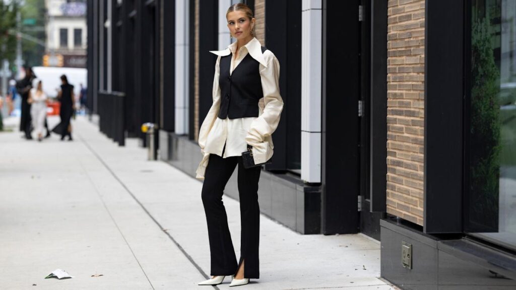Para combinar estos pantalones, la regla es sencilla: elige una blusa de manga corta o un top con cuello alto para equilibrar la silueta. En la oficina, un blazer estructurado y tacones de media altura completan el look; en la noche, un top brillante y sandalias de tacón bajo crean un estilo chic.